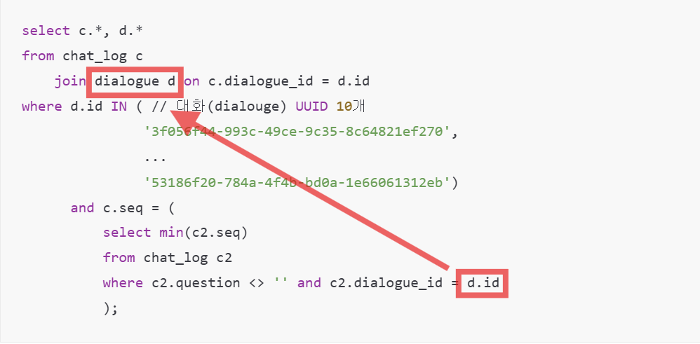 and c2.dialogue_id = d.id -- ๋ฌธ์ ์ ์์ธ
